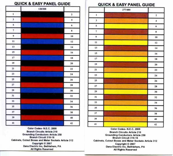 Pocket sized reference guide. Color code 120/208 on one side 277/480 on the other. Great for wire pulling set-up. For more info contact me at danaelectric@live.com for more details. $ 2.25 included shipping.